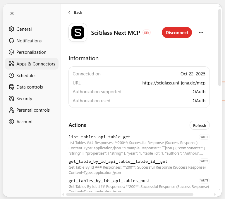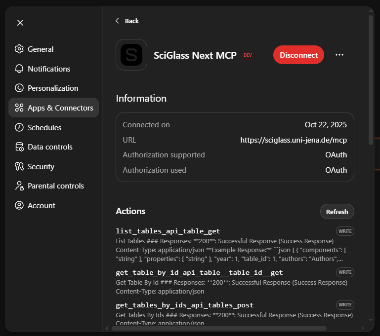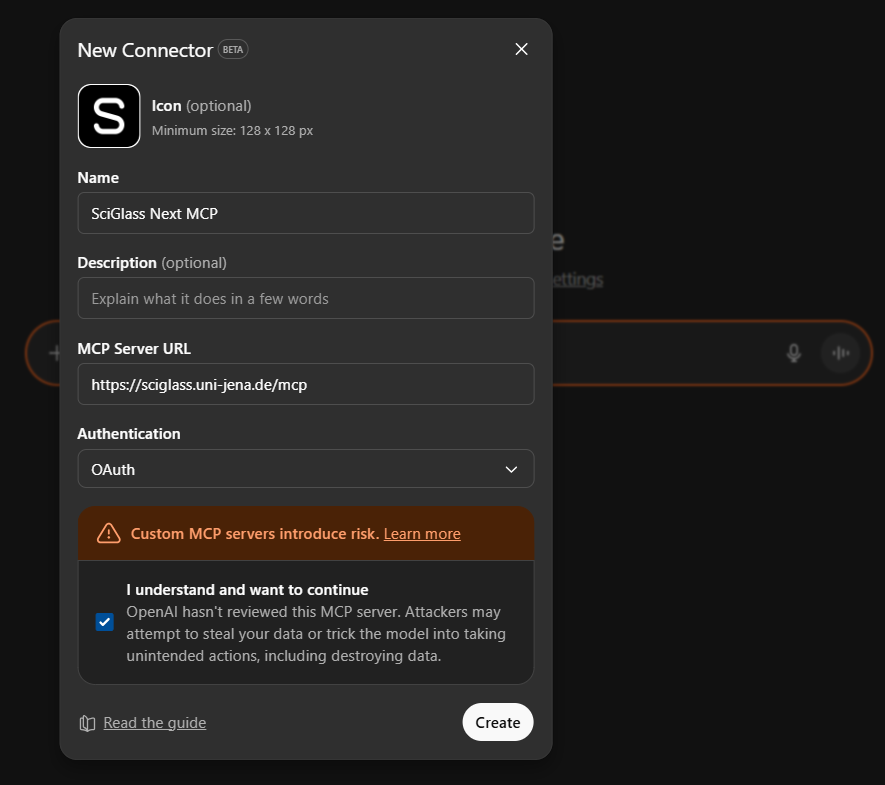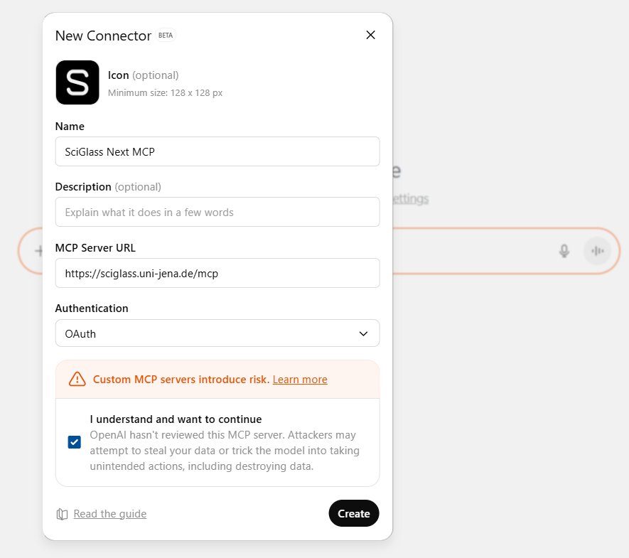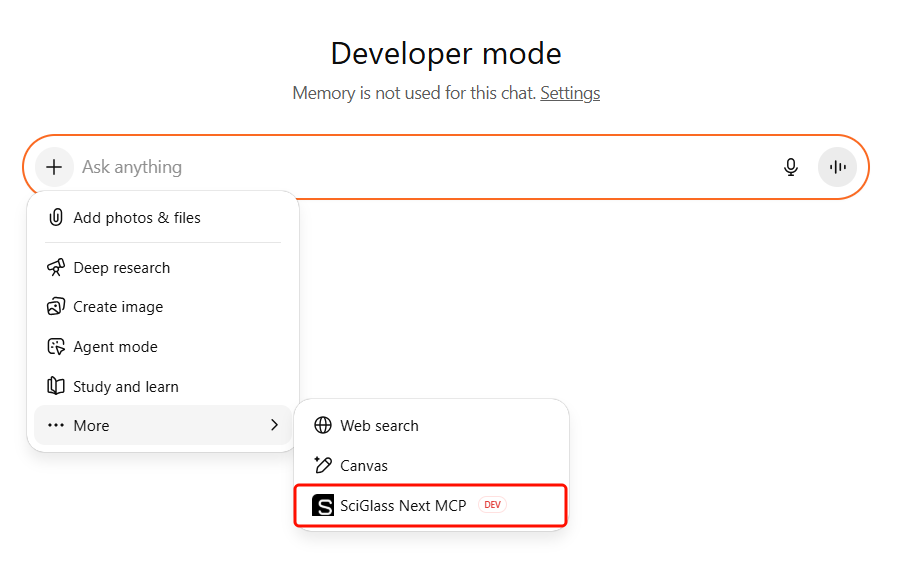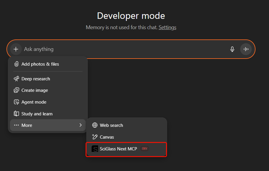 You can connect SciGlass Next MCP to ChatGPT if developer mode is enabled (available for ChatGPT Plus and above). Once Developer Mode is enabled, you can add the SciGlass Next MCP server following the in-app instructions.