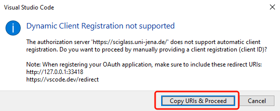 You'll be prompted to manually enter the client ID. Click Copy URIs & Proceed